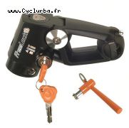 J'ai trouvé sur le site de la société qui commercialise l'éclairage complémentaire Reelight, un système d'antivol que je ne connaissais pas, le FreeLock, qui permet de : « désolidariser le couple potence - guidon de la fourche : le vélo ne peut plus être dirigé ». Une petite animation sur le site en montre le fonctionnement : www.oredon.com/freelock.php Moi qui essaie toujours d'attacher le cadre à un point fixe avec un U, il m'arrive parfois de ne pas trouver de poteau ou, plus souvent, d'en trouver des trop gros (j'y attache alors le vélo, mais avec un antivol flexible à spirales bien moins résistant). Il me semble que ça pourrait alors être un bon complément, comme les antivols fixe de cadre.