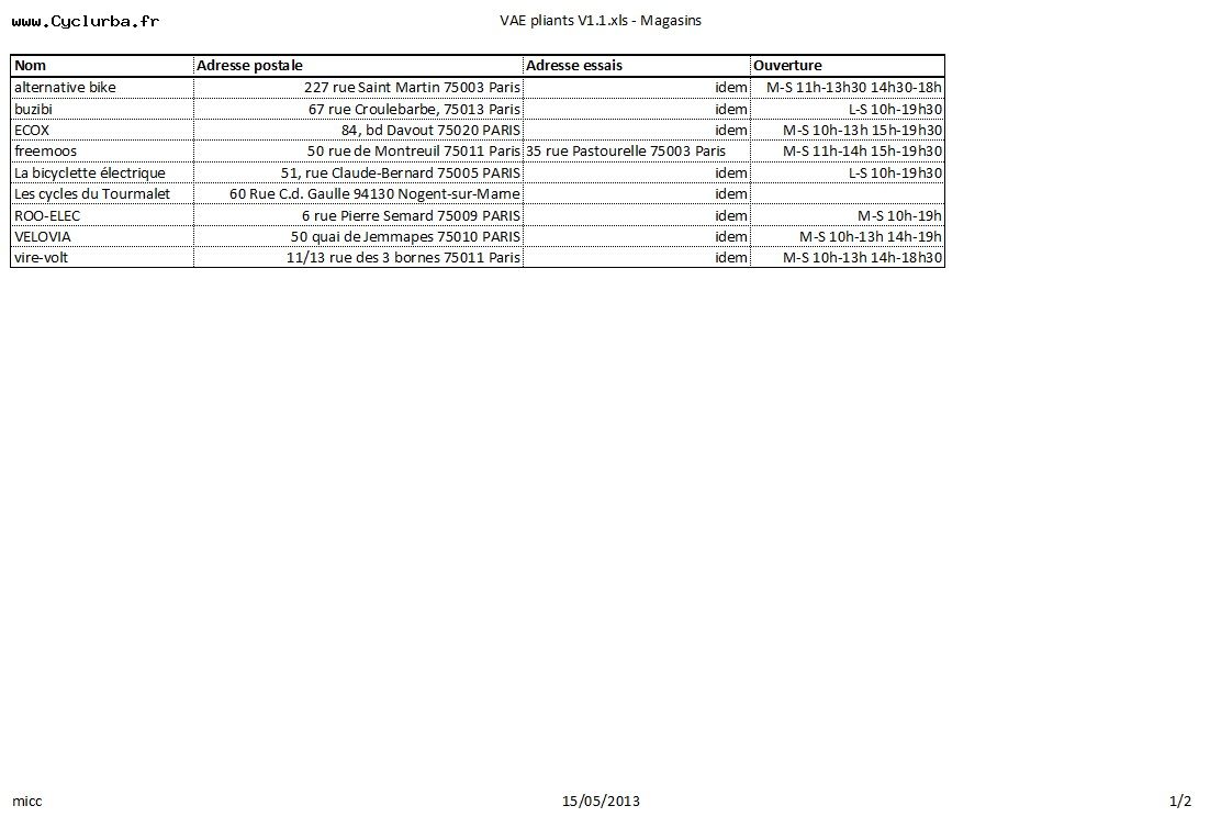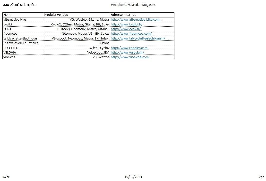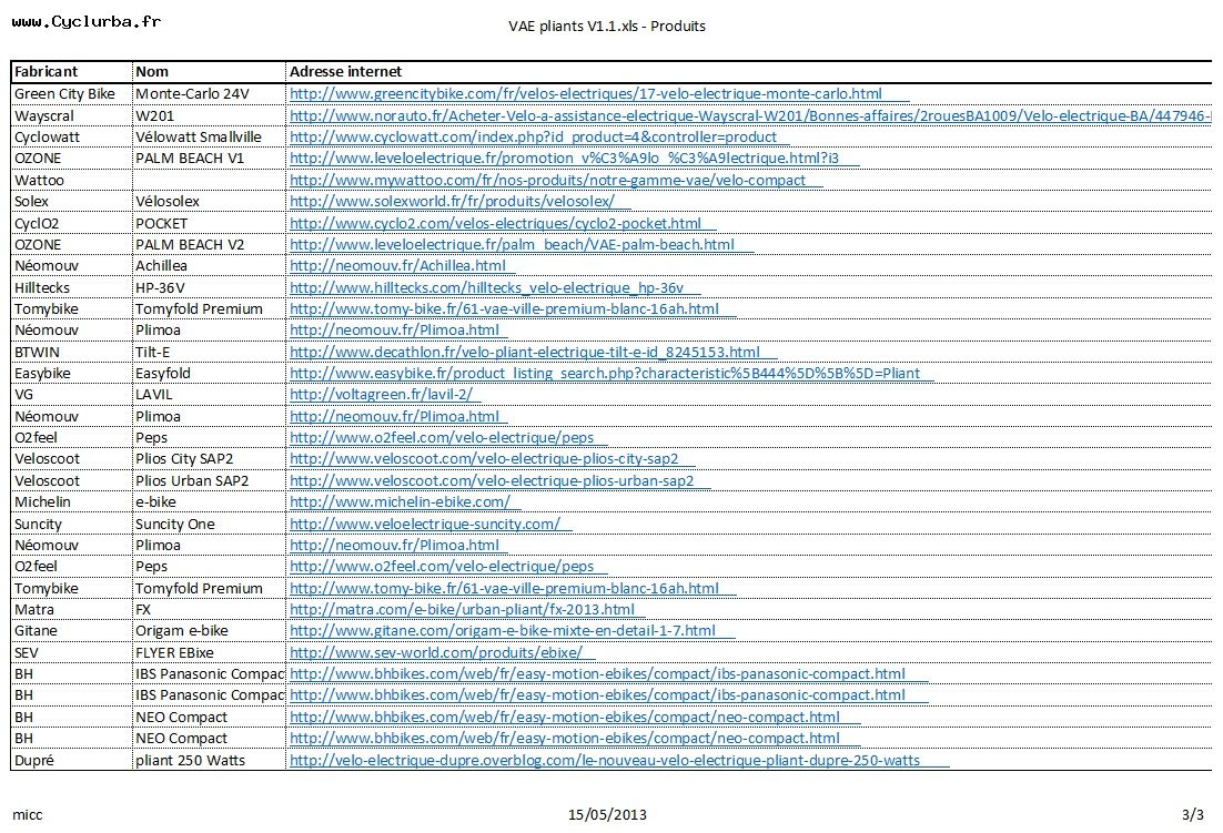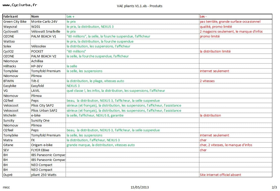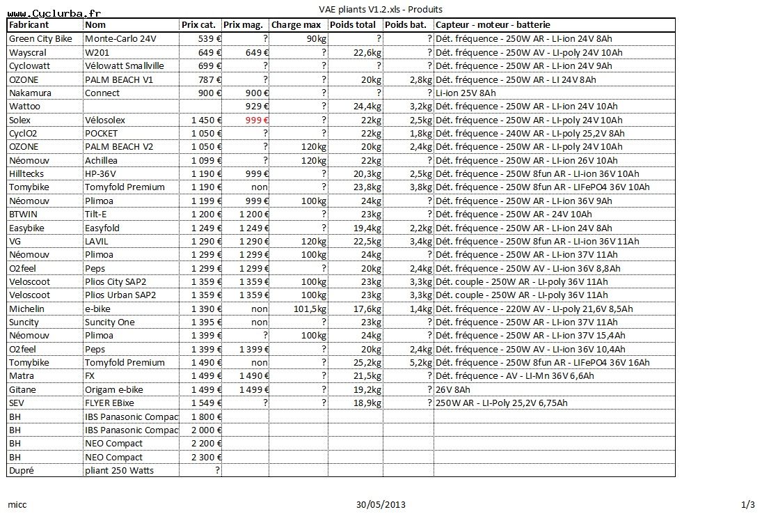 Grâce principalement à ce site, j'ai réalisé un petit tableau pour faire le tour des VAE pliants de 20 pouces à 1500€ et moins. Je l'avais réalisé pour aider mon frère à faire son choix et accessoirement pour en choisir un aussi pour ma femme.