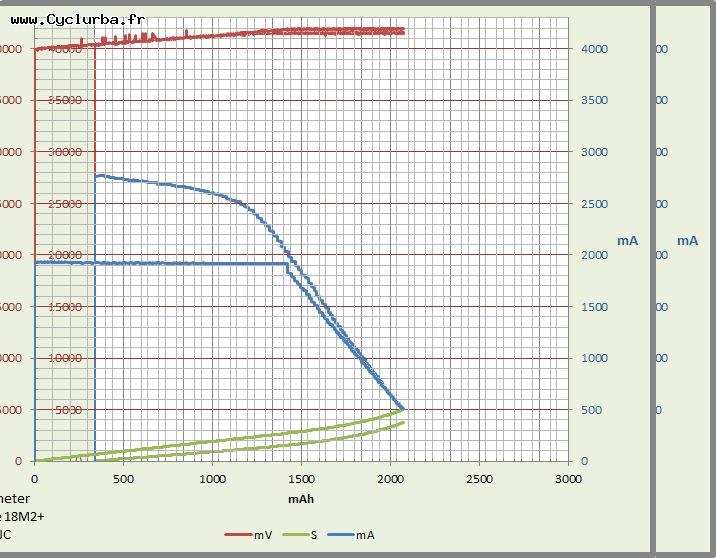 entre 1600 et 1800mAh, ça resiste encore à 2,75v ... puis plouf jusqu'à 2020-2050mAh et 2,0v.