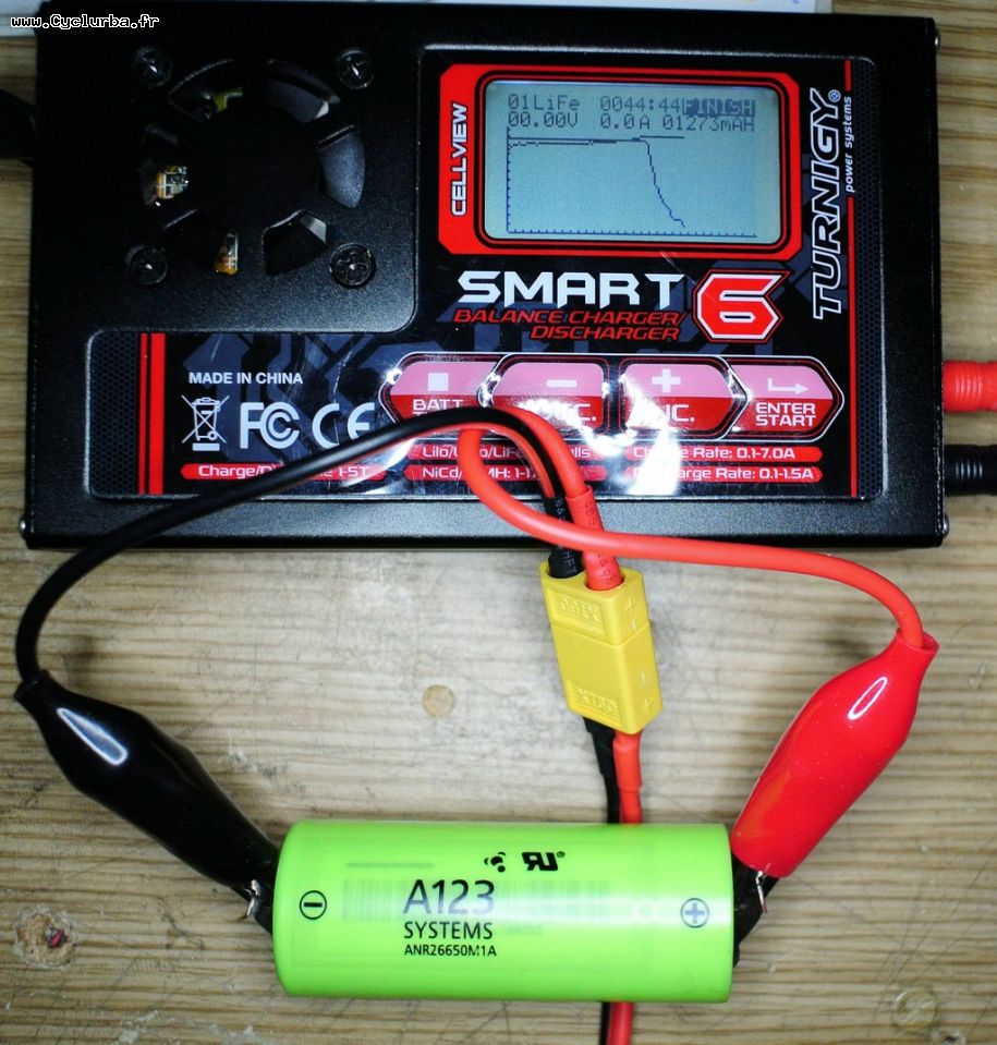 la photo indique une recharge effectuée à 50% de décharge, la A123 fait 2,1Ah restitué.
