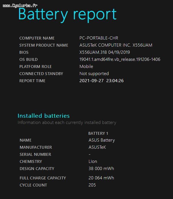 Je ne sais pas si tu as utilisé celle-ci mais la commande "powercfg /batteryreport" donne la capacité batterie d'origine et celle actuelle (c'est assez complet et les cycles semblent calculés correctement).