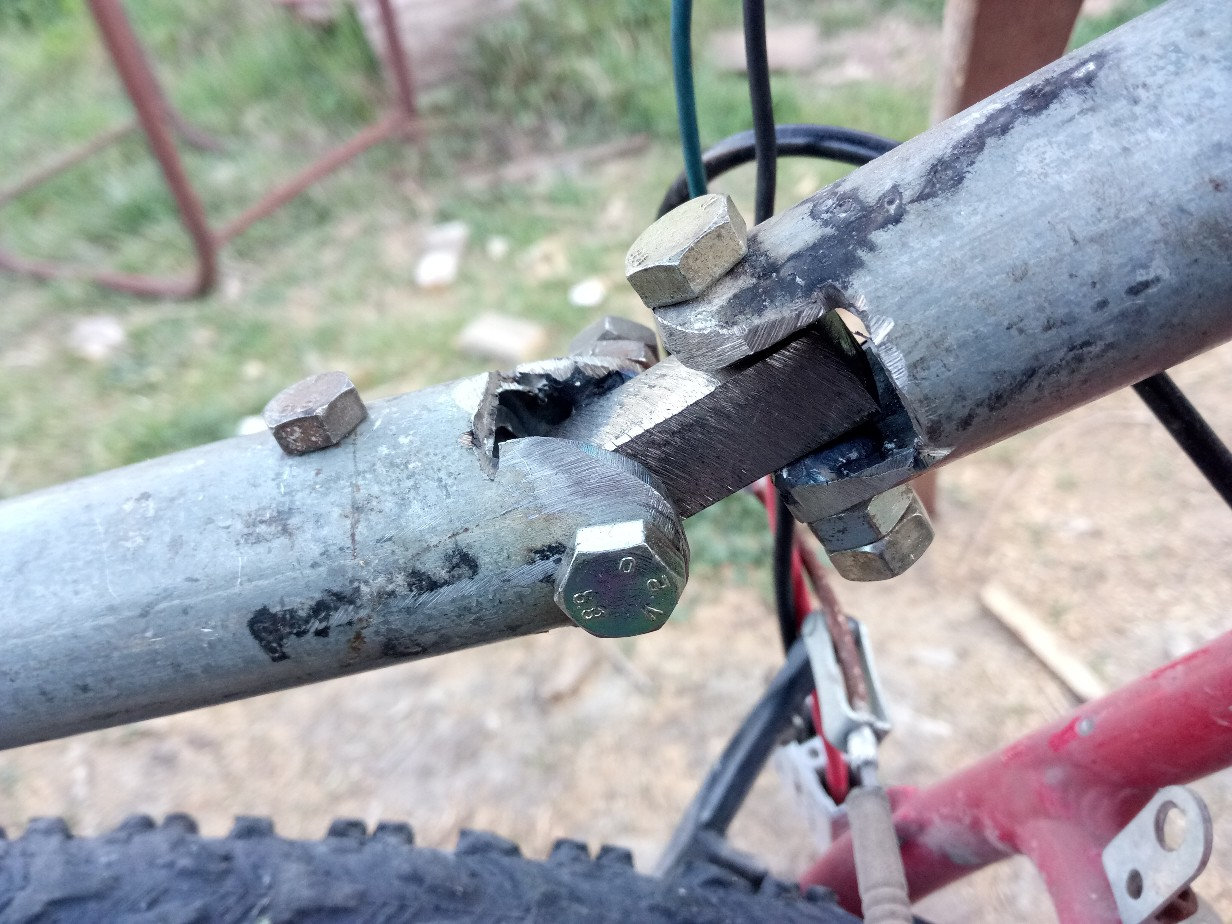 Pour le cardant je me suis inspiré des petits cardant de clef à douille. Le châssis est en allu, c'était une partie de parquet de vieux zodiaque. Roue 24" fixé via des fourches à vélo couché. Pour la fixation du cardant j'ai soudé un bout d'acier perpendiculaire à l'axe afin de le vissé à un autre bout cintré à l'arrache qui épouse la tige de la selle. À l'intérieur j'y ai colle à l'époxy du cuir pour protéger la tige de la selle et aussi faire adhérence.