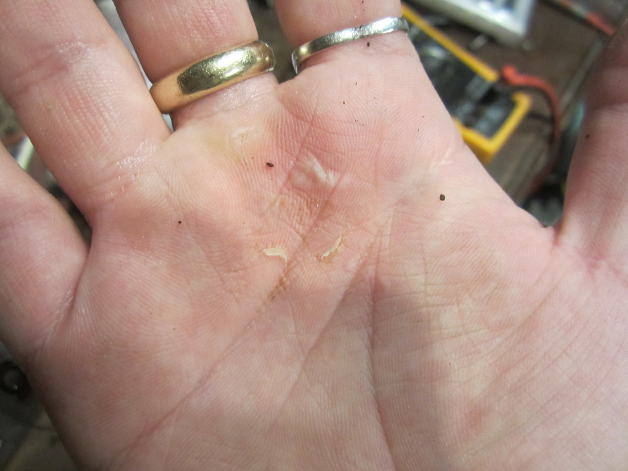 - Et une brûlure au second degré sur la paume de ma main (mais je m'en sors bien, ça ne m'a plus fait mal depuis ce matin)