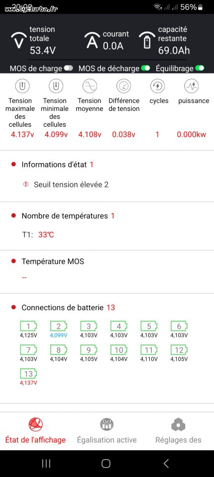 Ensuite lorsque j'ai débranché le chargeur, la tension du pack a chuté subitement à 53.4V avec la tension du bloc 13 la plus élevée = 4.137V (voir photo), le compteur du contrôleur affichant cette fois une charge de 99% (contre 95% auparavant avec l'équilibreur branché)
