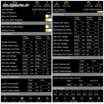 hey je reviens sur ce sujet que j'ai laissé de coté un moment, re revois toutes mes config actuellement pour faire du propre et j'ai toujours cette batterie, son bms plus exactement qui me pose problème avec le soc, c'est du grand n'importe quoi, à 52v le soc passe à 5% alors que je le configure à 90% à 4.1v/cellule , je rappel que c'est une 13s. bref j'ai contacté le sav pour qu'il me file un password qui permet de mettre à jour le firmware du bms au cas où celà résoudrait le problème mais le mien serait trop vieux pour faire la manip cependant ils m'ont dit qu'il fallait faire une charge complète en faisant s'activer la protection survolatge du bms, et faire la même avec une décharge complète. Du coup je sais pas trop comment configurer le bms pour qu'il soit en protection sans abimer les cellules et tout en les chargeant à 100% , est ce que si je set la protection autour des 90% de charge l'étalonnage du soc se fait quand même? ou est il nécessaire de charger à 4,2v/cellule? et dans ce cas à combien faire démarrer l'équilibrage et à combien mettre la protection survoltage?