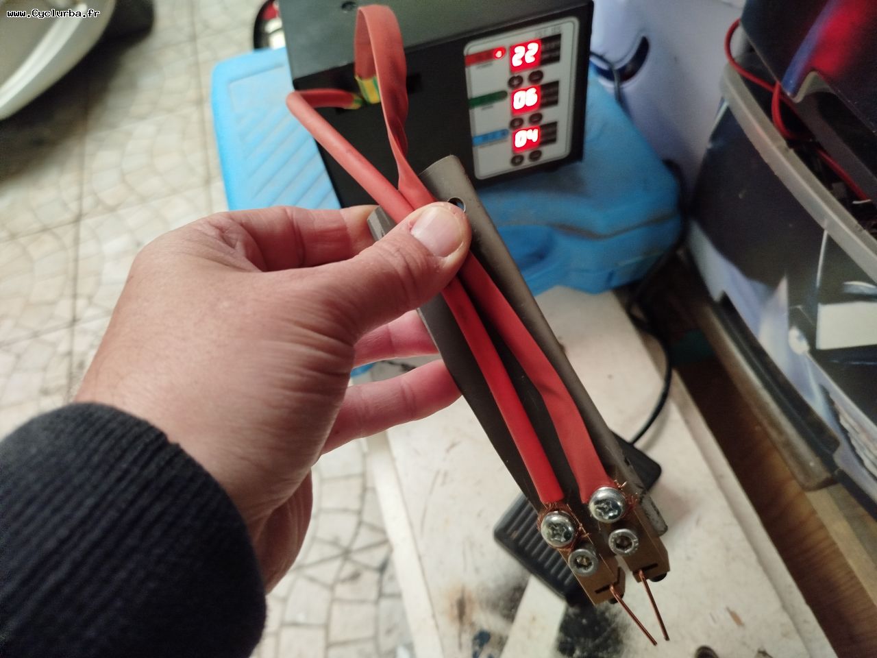 Bon ce n'est pas extraordinaire mais j'ai pu utiliser la soudeuse par point avec une intensité absorbée allant de 12 à 16A pour des languettes de 0,10mm d'épaisseur. D'origine c'est 20A préconisé.